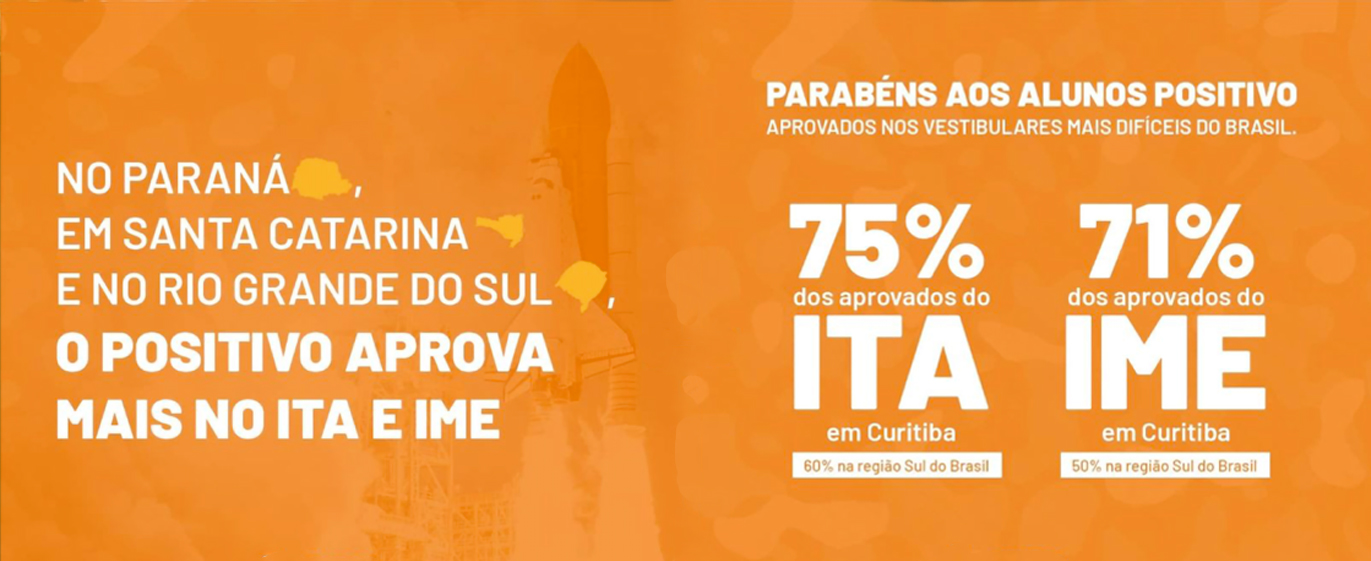 O Curso Positivo fechou 2021 com chave de ouro, reafirmando sua liderança em aprovações nos maiores vestibulares Brasil afora. No dia 23 de dezembro, foram divulgados os resultados do Instituto Tecnológico de Aeronáutica (ITA) e do Instituto Militar de Engenharia (IME), considerados por especialistas dois dos vestibulares mais difíceis do país.