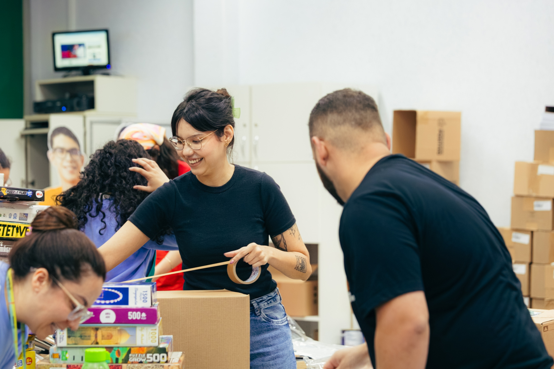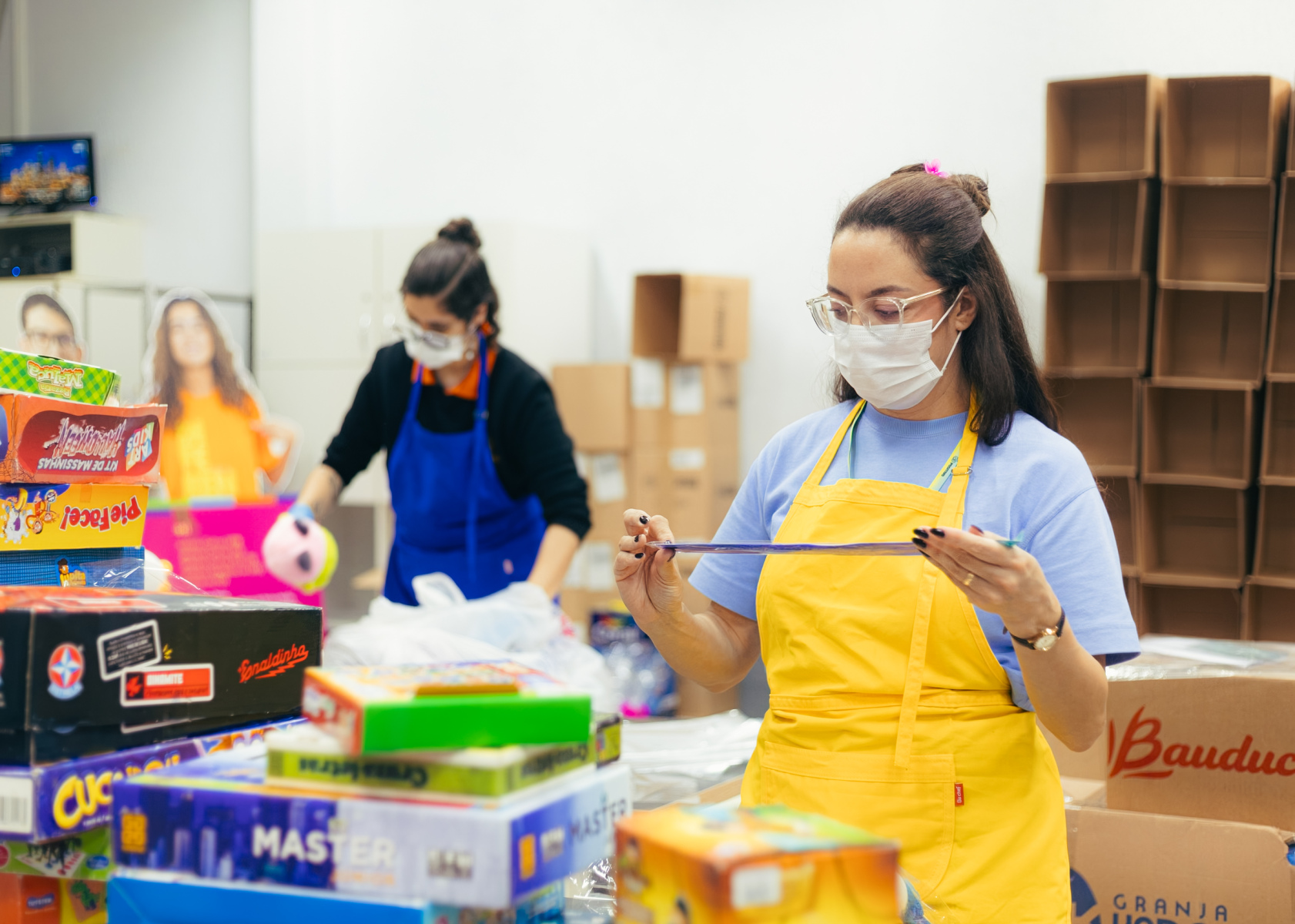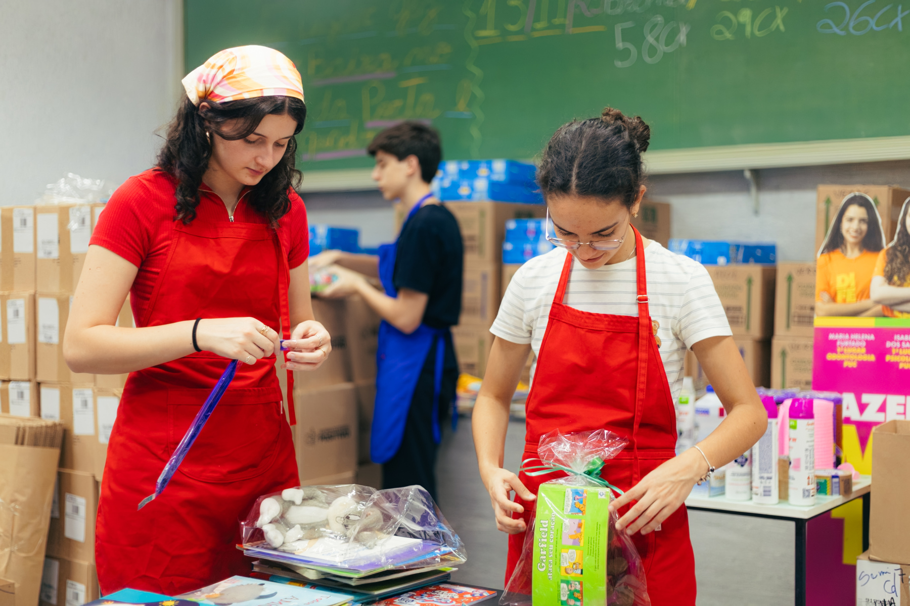 Atualmente, a equipe de voluntários, formada por colaboradores do Grupo Positivo e alunos dos colégios, com apoio e supervisão dos pais, está trabalhando na triagem e organização das doações. Já são 50 caixas prontas, cada uma contendo aproximadamente 10 kits compostos por brinquedos, livros e cartinhas preparadas com muito carinho. Ainda há muitas contribuições em processo de separação, e o número final deve ser ainda maior.